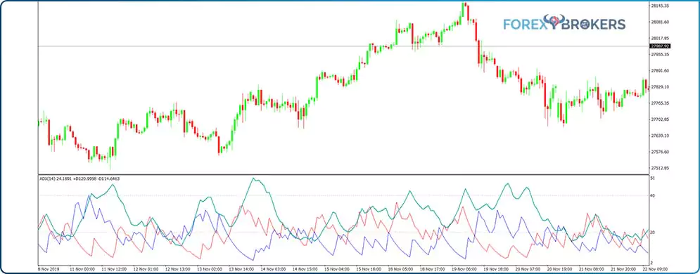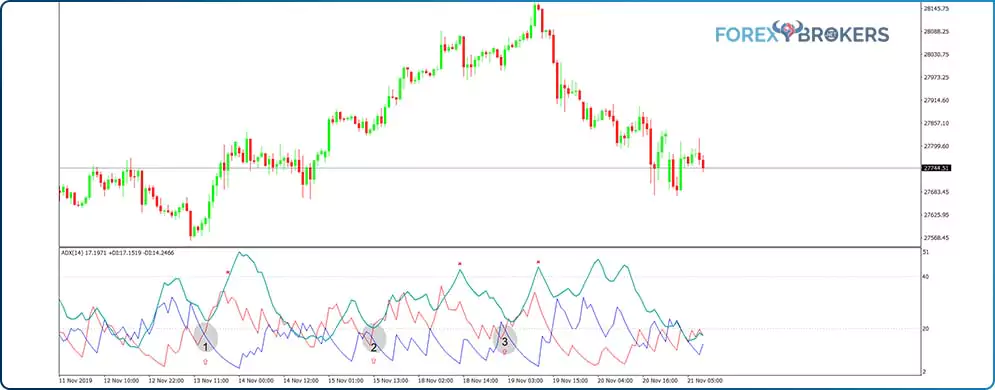 The ADX works best in intraday trading. If we check the earlier DJIA hourly chart, there were three distinct trades when the market trended higher. The sign in front of the two DI lines reflects the direction of the potential trend – bullish or bearish.