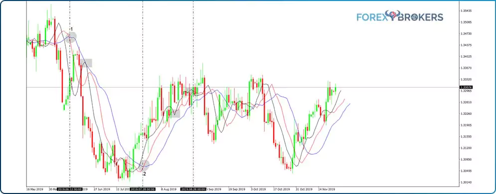 The second example perfectly illustrates this phenomenon. The vertical line shows when the red moving average establishes the trending order. As mentioned above, the entry point is five periods earlier, and the faster moving average crosses below the median one twice. When the second cross appears, that’s a signal that the trend isn’t that strong anymore and traders should think of closing their long position or moving their stop-loss to the break-even point and booking partial profits.