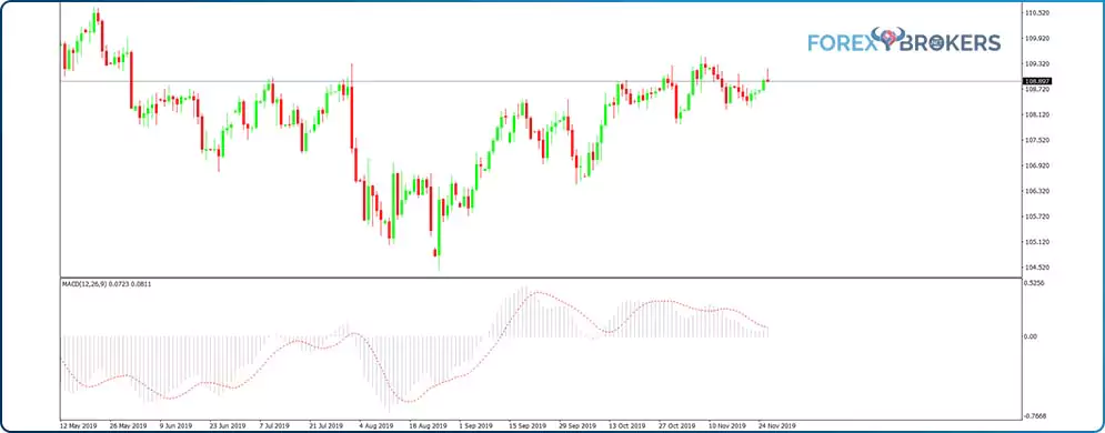 The USDJPY daily time frame below shows three instances where the MACD works as a trend indicator. From left to right, the first case shows a strong bearish trend forming after the MACD bars drop below the zero level. Traders wishing to ride such a trend should remain on the short side until the bars become small enough to close above the signal line.