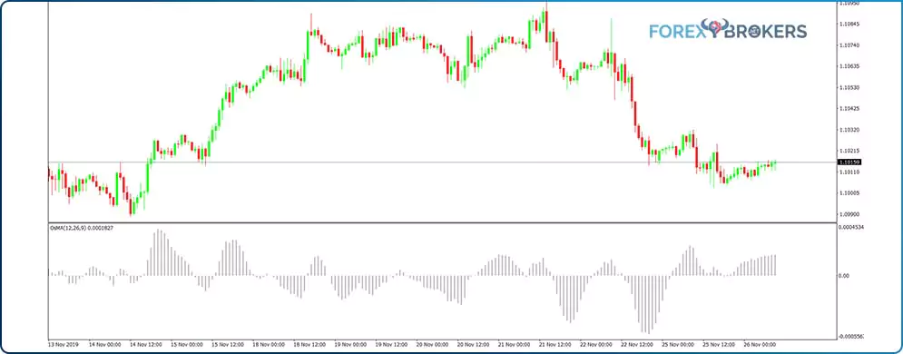The Moving Average Convergence Divergence (MACD) is a similar indicator to the OsMA, plotting a histogram in a similar fashion. On top of that, the MACD shows a signal line that reflects the bullish or bearish potential.