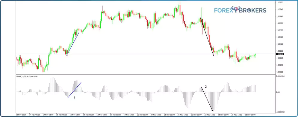 The second example on the right side of the chart shows a bearish setup. The market consolidates without a meaningful pullback, and the signal appears when the bars begin declining again. At the moment the bars become negative, go short with the exit when the OsMA bars stop the decline.