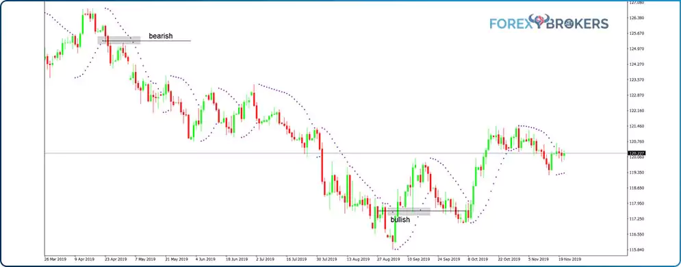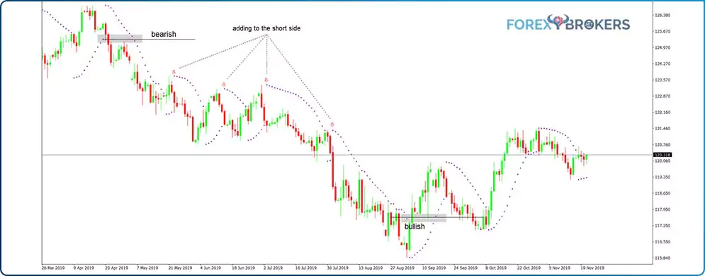 The acronym SAR stands for “stop and reverse.” The original idea of the inventor (J. Welles Wilder Jr. – the same person that developed the famous Relative Strength Index oscillator) was to build a stop-and-reverse system by the time the dots changed direction. However, the indicator was built on the stock market, meaning the conditions on different markets, especially volatile markets like the currency one, require different interpretations.
