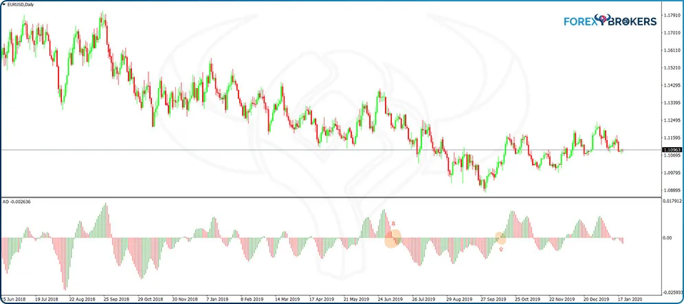 The Awesome oscillator has either positive or negative values depending on what the moving averages do. When the fastest-moving average is trending higher than the slow one, the Awesome oscillator plots positive vertical bars. When the opposite happens, the bars have a negative value.