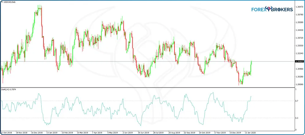 Let us take the first trade from left to right on the USDCAD daily chart above. The DeMarker oscillator reaches the overbought area, but the price continues to rise for a while. The big red candlestick marks the crossing of the DeMarker below 0.7, a signal to go short until the oscillator reaches oversold levels.