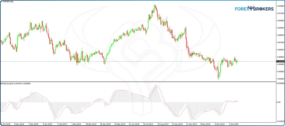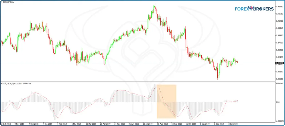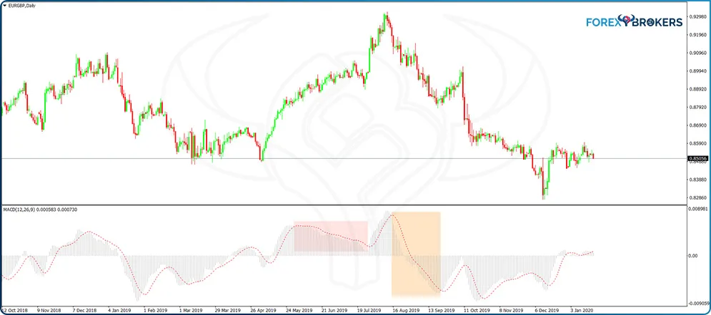A conservative approach means that traders wait first for the MACD histogram to turn negative before going short or positive before going long. The same EUR–GBP chart offers a perfect example as to why it is wise to wait for the MACD histogram to change sign before taking a trade (the pink rectangle shows a declining but still positive histogram while the price keeps rising).