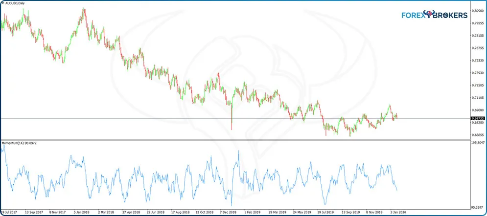 A quick comparison of the price action and the Momentum’s swings reveals that the oscillator moves away from the 100 level every time the AUDUSD pair traveled. Moreover, the moment volatility declines and consolidation begins, the Momentum oscillator comes back to the 100 mark.