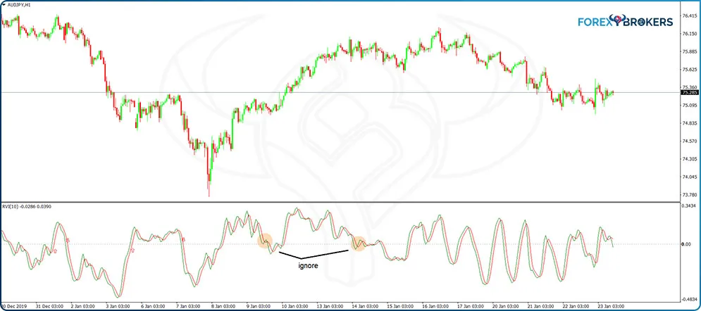 Next, buy or sell when the RVI crosses above or below the zero level, respectively. Tip: ignore the signals that appear after choppy RVI and trade only when the RVI crosses the zero level in a straight line.