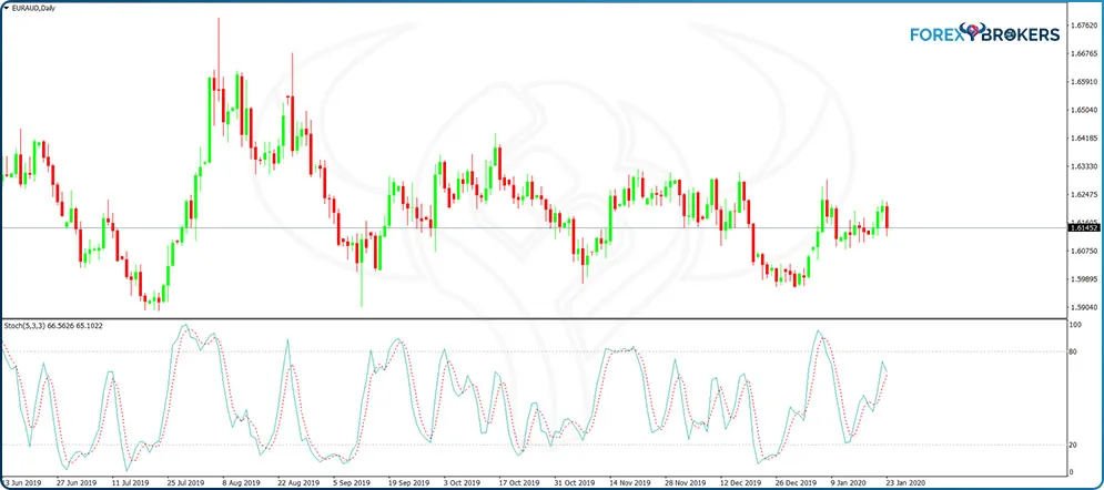 The Stochastics oscillator has an advantage when compared with other indicators in the sense that it has two lines, and one of them acts as a signal line. The red line is the signal line, and when it crosses above the blue line, in the overbought territory, it forms a bearish signal. A bullish signal appears when the red line moves below the blue one and in the oversold territory (i.e., below 20).