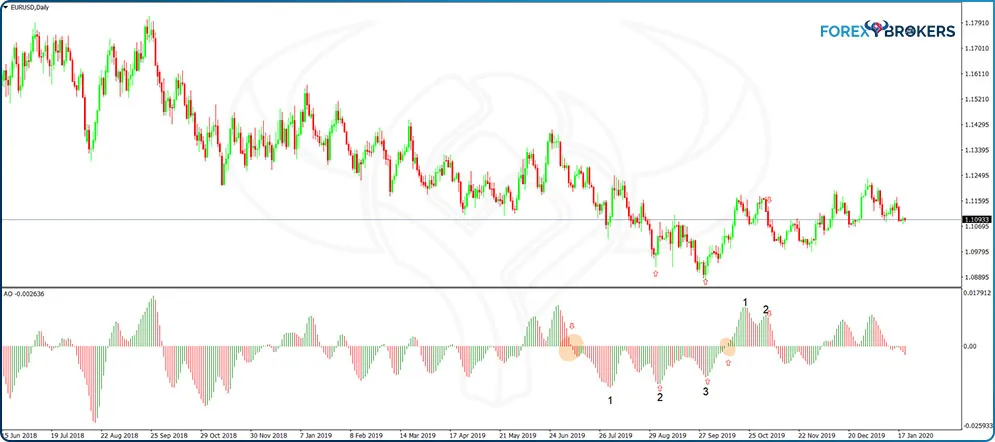There is also a bearish Twin Peaks setup following right after. The Awesome oscillator plots green bars; they turn positive as the market rises. Next, the oscillator starts plotting red bars, but without them crossing the zero level. The following green bars in the second peak do not extend beyond the previous peak’s high, and the oscillator puts a new red bar. That is a bearish Twin Peak setup, indicating a potential move lower.