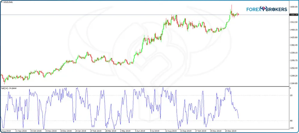 A strategy to consider combines the Williams oscillator info with trending conditions. Below is the gold daily chart showing the recent bullish price action on the yellow metal. It forms a series of higher highs and higher lows, specific to a rising market, in a bullish trend that started in the middle of 2018.