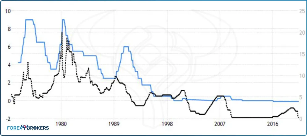 The blue and black lines on the chart above show the Japanese interest rate and the US federal funds rate, respectively, for the past fifty years. Focus on the vertical scales on the left and right side of the chart!