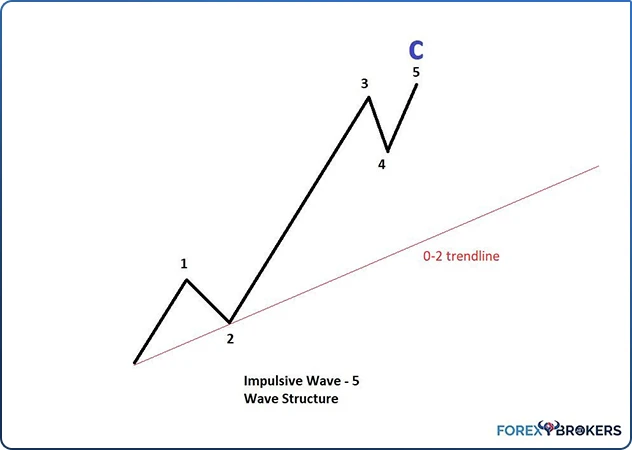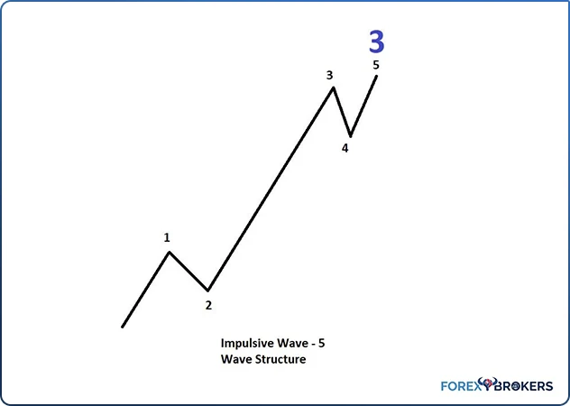 All three waves (first, third, and fifth) are impulsive, while the second and the fourth are corrective. The entire five-wave structure may be the first wave of an impulsive move of a larger degree, the c-wave of a flat, or wave a or c of a zigzag.
