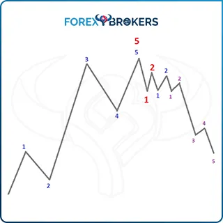 Namely, an impulsive wave (in blue) finishes an impulsive wave of a larger degree (fifth wave in red). Next, the first swing lower is the first wave of a new structure and so on. Each swing represents the start of a new cycle of a lower degree until a five-wave segment develops.