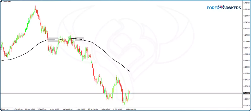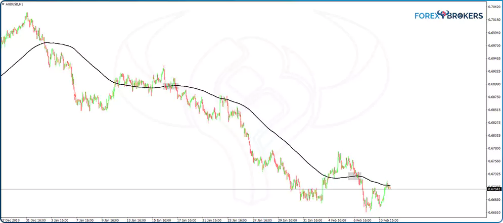 The AUDUSD hourly timeframe below shows the pair dropping from the 0.7 area with two market bounces. The two instances, marked on the chart with two grey squares, show the only moments when the MA started to rise.