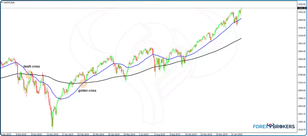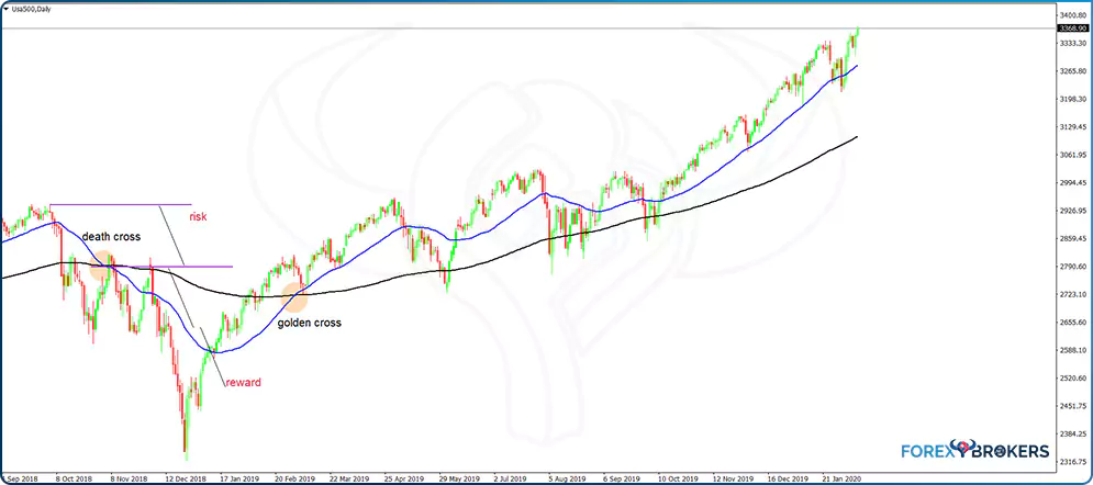 Because the trading setup for golden or death crosses uses the daily timeframe, traders know that this is a big enough timeframe to have a meaningful impact on prices for the medium to long term. Therefore, often the business news channels mention when the S&P500 forms a golden or death cross as an indication that the stock market has entered bullish or bearish territory.