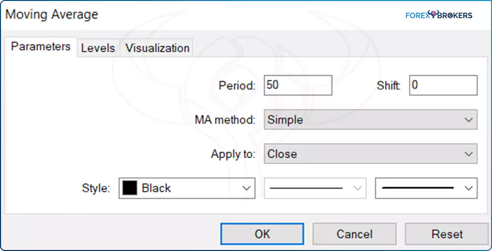 Every parameter of an MA is customizable. The Period tab shows the number of periods considered by the MA – in this case, 50 periods, a common MA used by many traders.
